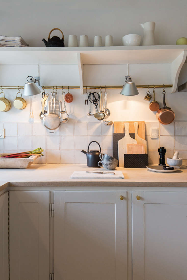 Above: Tolomeo Clip Spot Lights run along the brass kitchen rail, illuminating a backsplash of handmade ceramic tile and countertop of Dinesen Douglas fir.