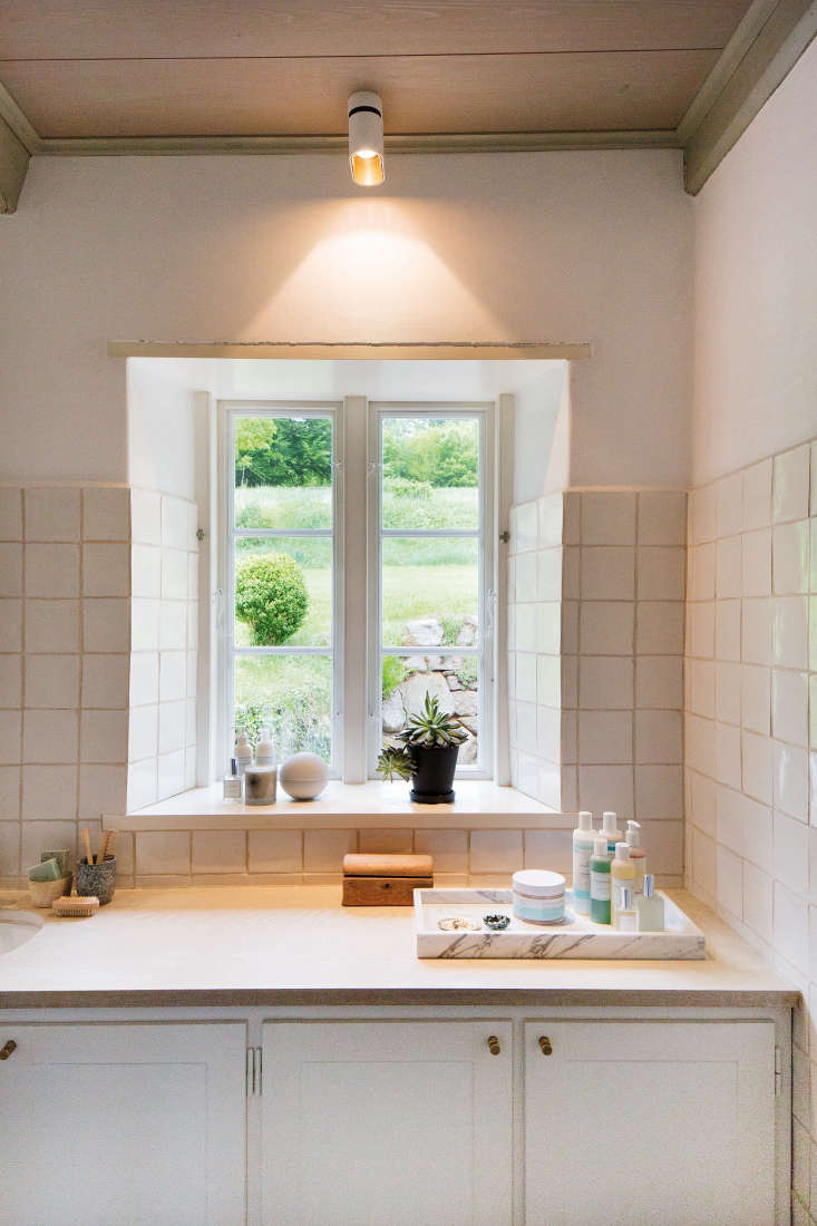 Above: The bathroom design mimics the look of the kitchen, with the same handmade tiles, wood counters, and brass pulls.
