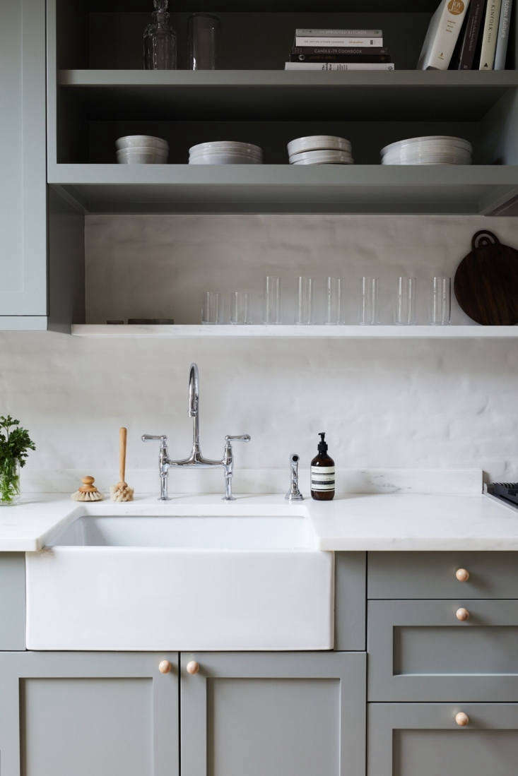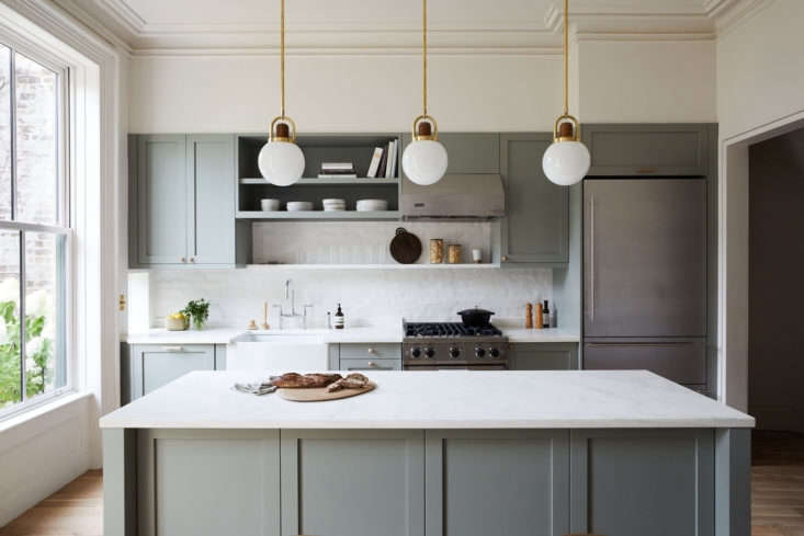 Above: The Farrow & Ball Pigeon paint color is painted on the kitchen cabinets.