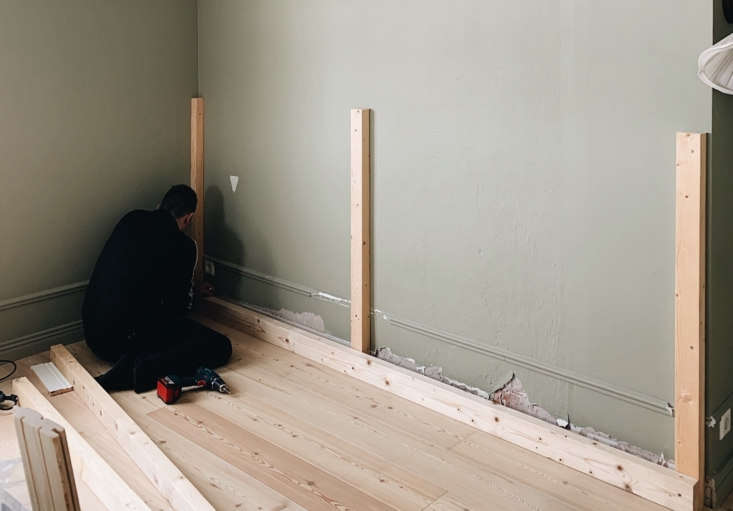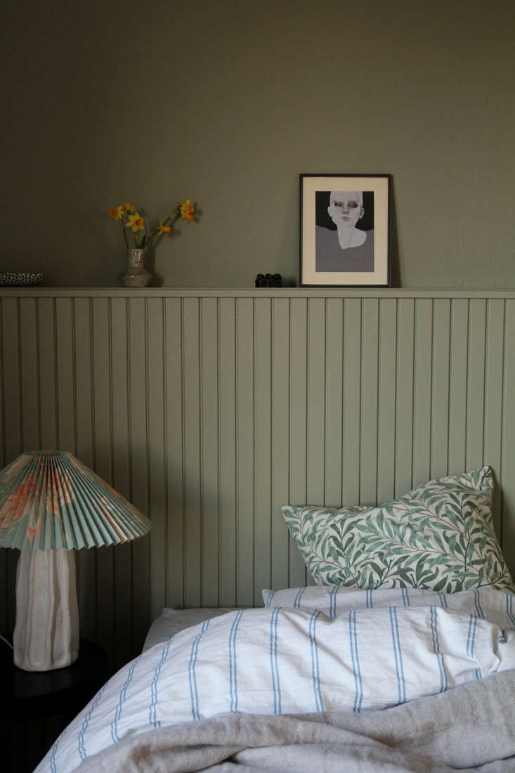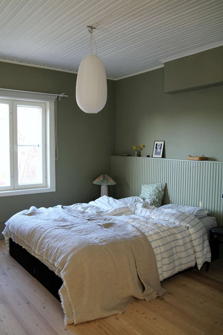 Maiju and her family live in the small town of Vaasa on Finland’s west coast. Two years ago they moved into their 1941 house and since then she’s be puzzling over how to make her and her husband Janne’s compact bedroom feel “less empty without crowding it with furniture.” Taking inspiration from the room’s paneled ceiling—and all the paneling she’s been admiring in other people’s quarters of late—Maiju came up with this DIY built-in headboard of homemade beadboard. She kindly agreed to share the project with us.