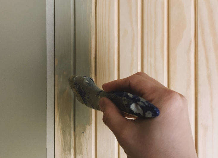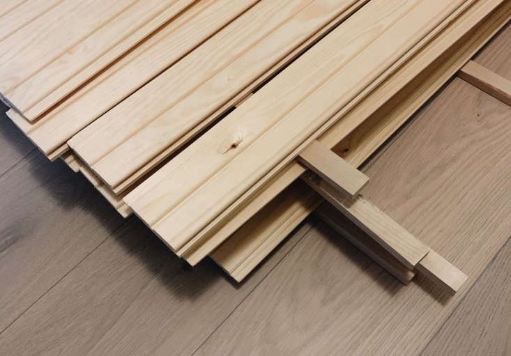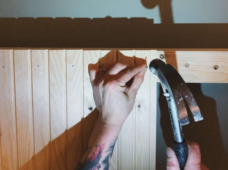 Above: Maiju used pine panels (shown here) that are much like Lowe’s Unfinished Pine Tongue and Groove Walls Planks. You can also buy readymade primed beadboard paneling in a range of materials from Home Depot and other building supply stores.