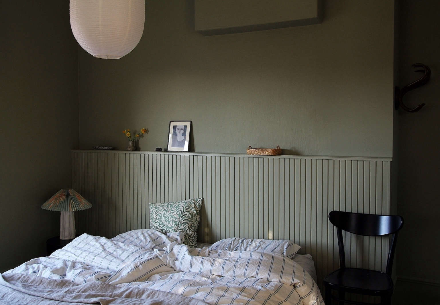 Above: Maiju made the bedside ceramic lamp at a clay workshop and finished it with a vintage pleated shade. The leaf pillow is made from a William Morris fabric bought on Etsy; the striped bedding is from H&M Home.