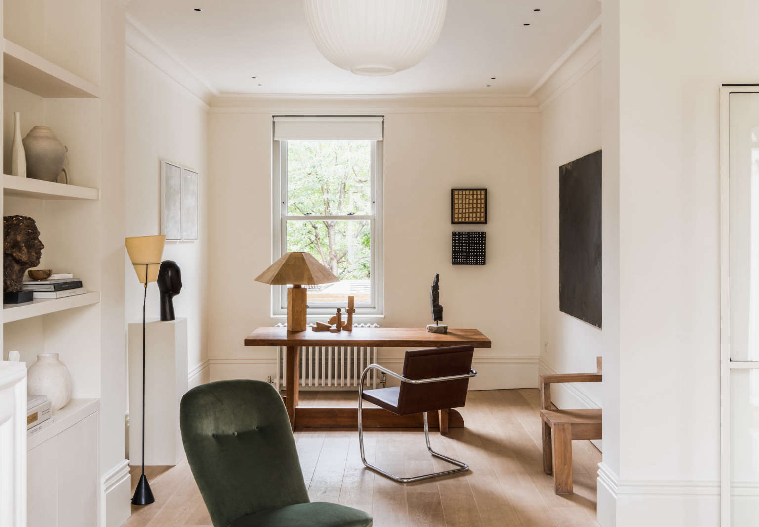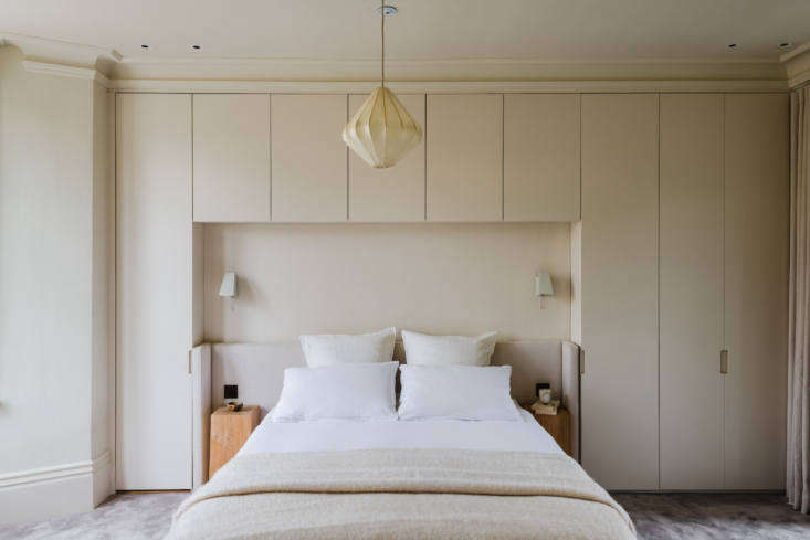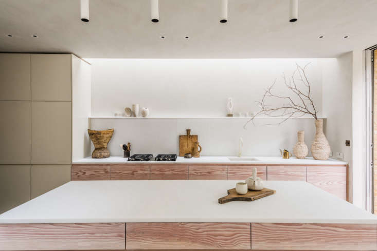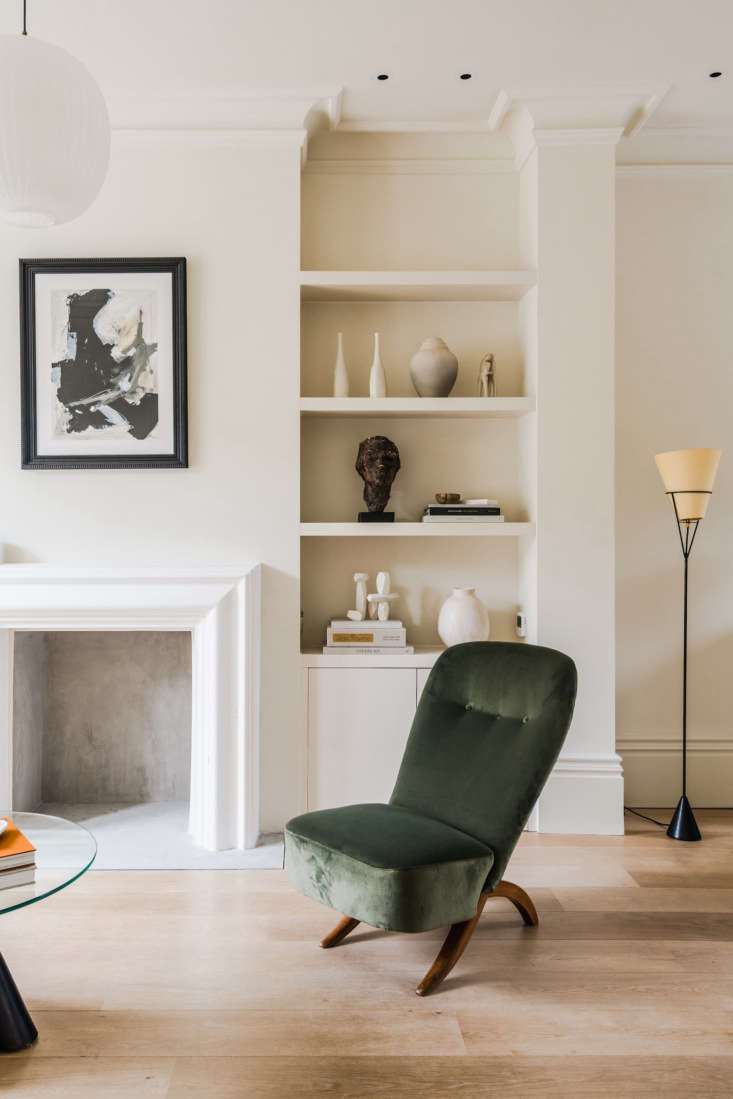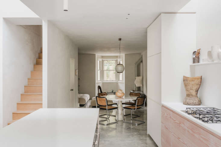 To this end, the architects added lightwells to invite in more natural light; they excavated the basement to create a large open kitchen and sitting room; they added an attic guest suite; and they created a cohesive palette of off-whites (a mixture of pale Farrow & Ball colors in the rooms and lime washes in the corridors and basement, says Reema). Daytrip also enlisted Sophie Pearce of Béton Brut and Laura Fulmine of Modern Art Hire to decorate the home with rare vintage modern pieces, and architectural lighting studio There’s Light to provide lighting solutions.
