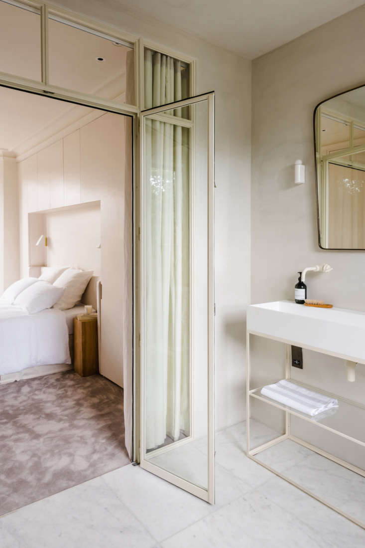 Above: A steel and glass partition separates the bedroom from the bath. The custom vanity unit is from Iusso Stone.