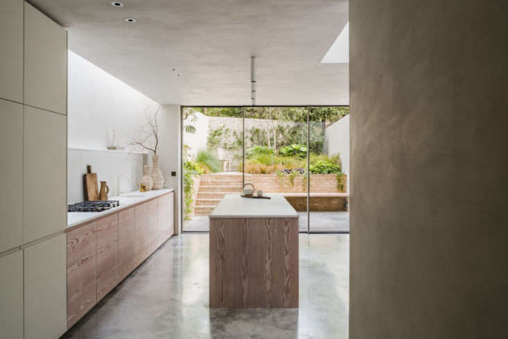 Above: The basement level features polished-concrete flooring throughout and even extends seamlessly to the garden, just beyond the sliding doors in the kitchen.,