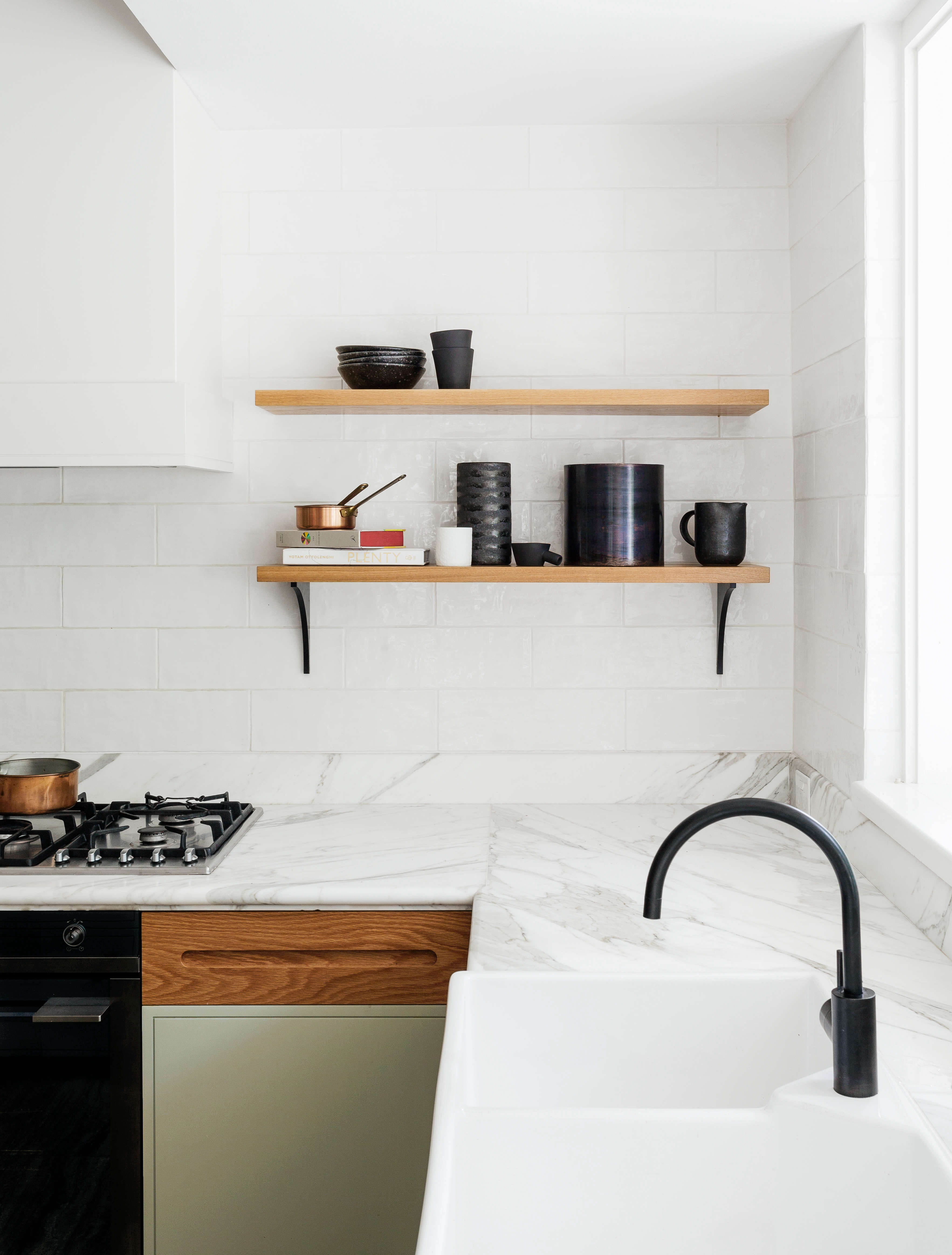 The open shelves have arched brackets made of MDF: “We couldn’t find the right little black brackets,” explained Arent & Pyke associate Dominique Brammah. “so we designed our own and our crew made them.”