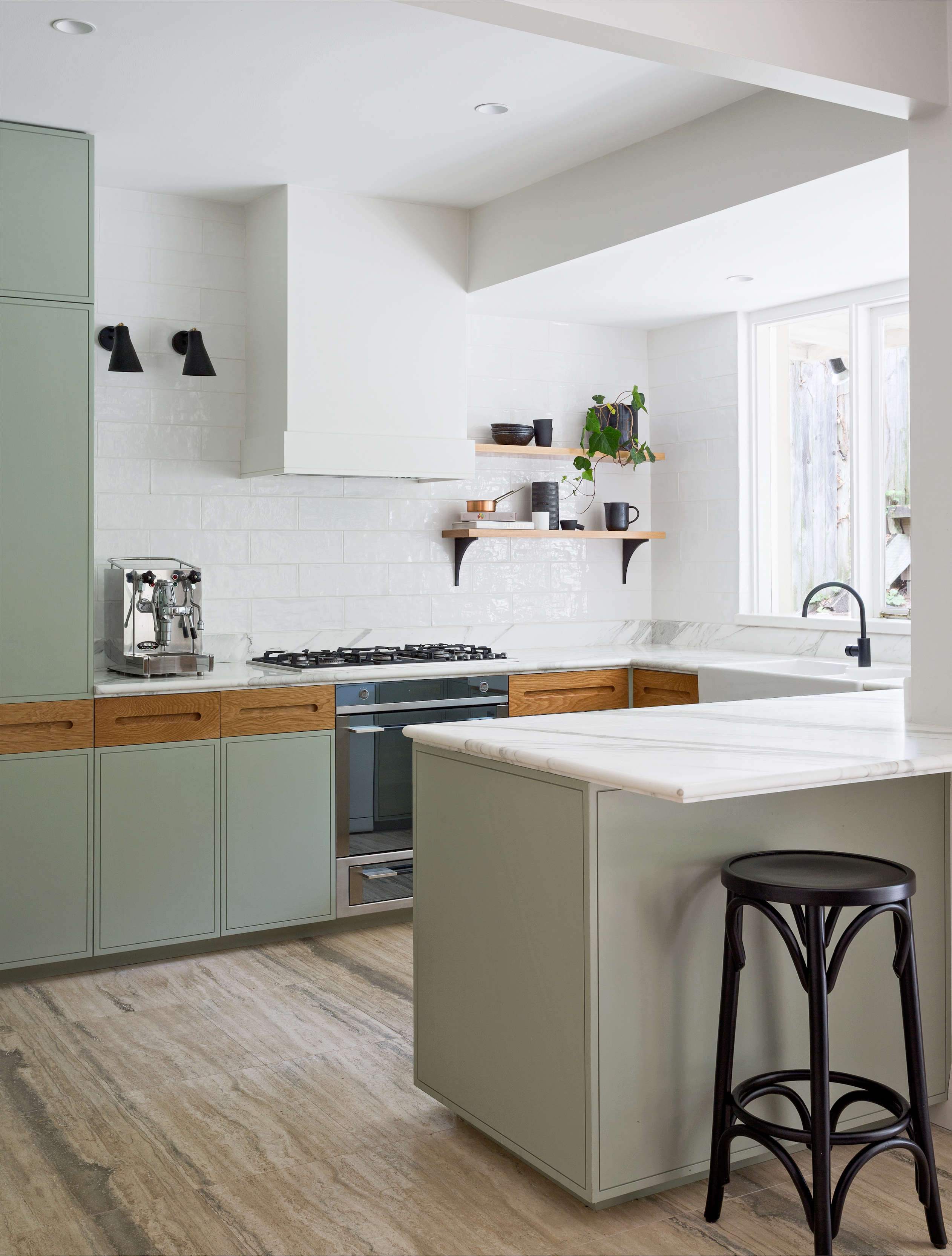 Above: The kitchen is set in the back of the house overlooking the garden, which provided inspiration for the color and materials choices. “The palette,” the designers say, “is layered from the earth upwards, growing from silver travertine flooring to mossy green cabinetry and natural solid oak with a fade to pure white.” Black accents also punctuate the space, including a classic Thonet bentwood barstool.