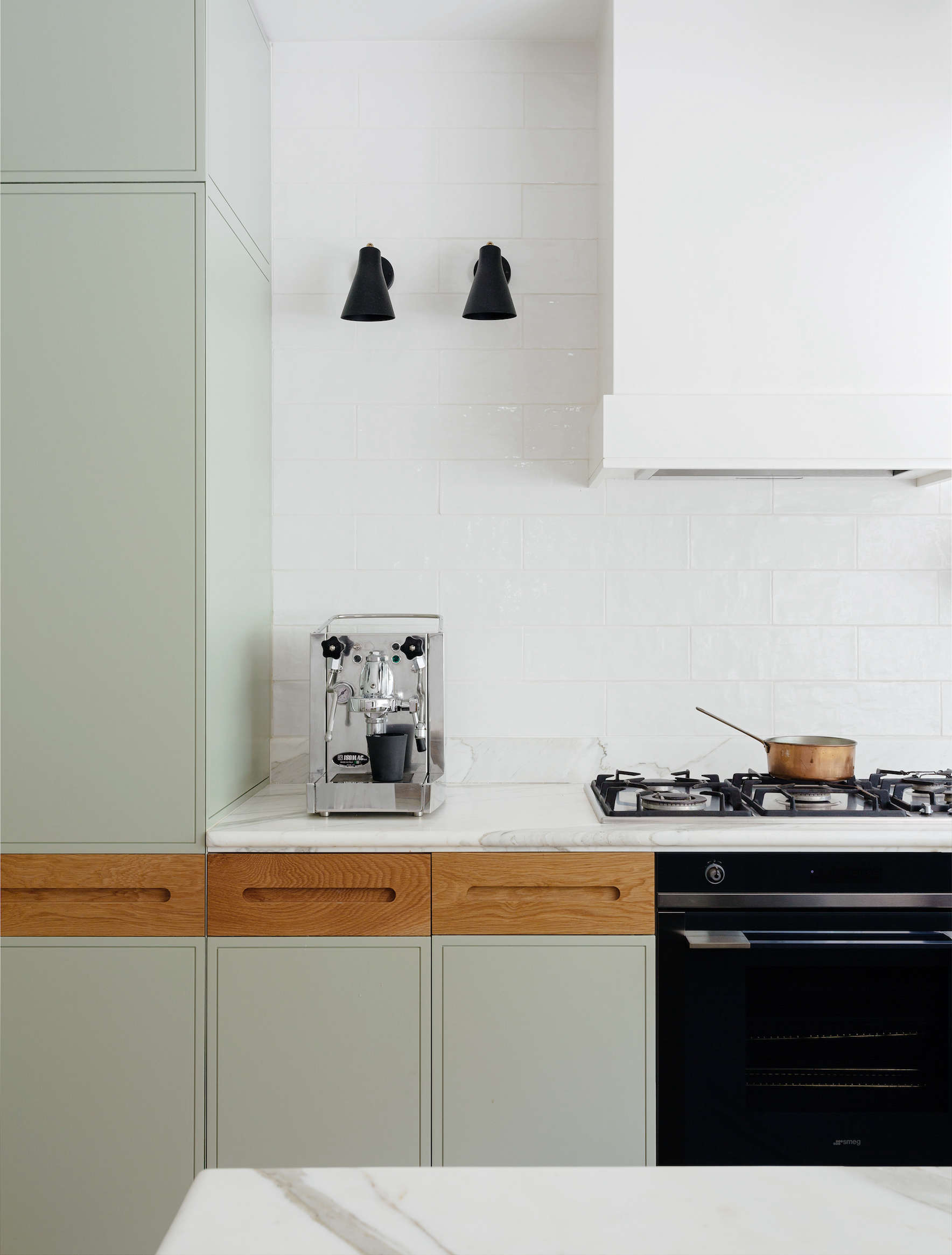 Above: The glossy, outsize subway tiles are handmade (sourced from The Art of Tiles) and the Miller sconces are by Rubn: See New Classics from Sweden. Tall cabinets next to the counter serve as the pantry. A stainless steel fridge and freezer stand on a side wall.