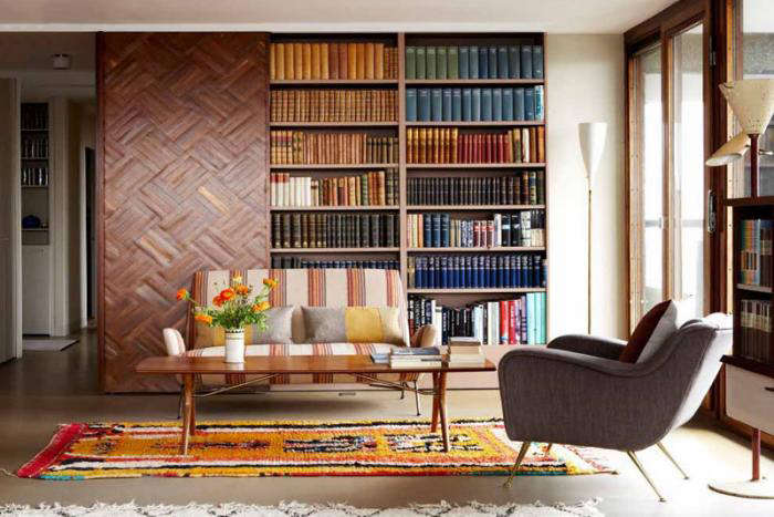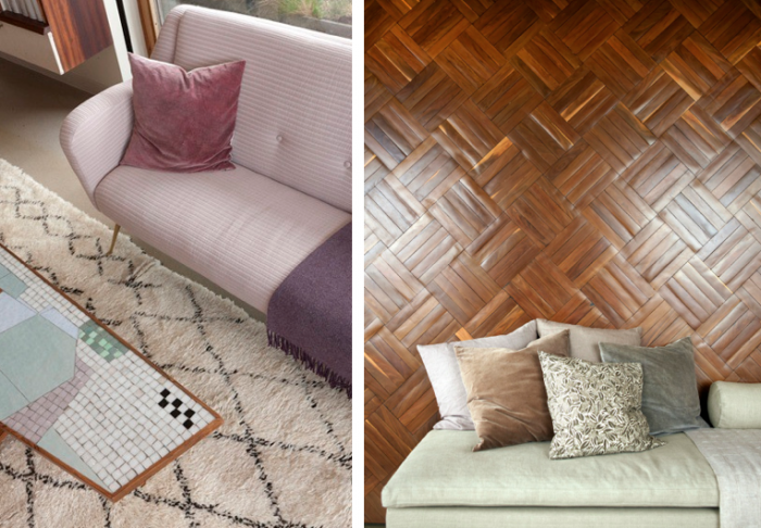 Above L: The colors of the large and small mosaic tiles in this 1950s boomerang-shaped coffee table inspired the tones of the upholstery in the living area of the flat. Above R: A more neutral palette sits in front of the sliding partition, made from reclaimed parquet flooring from the floor of a primary school.