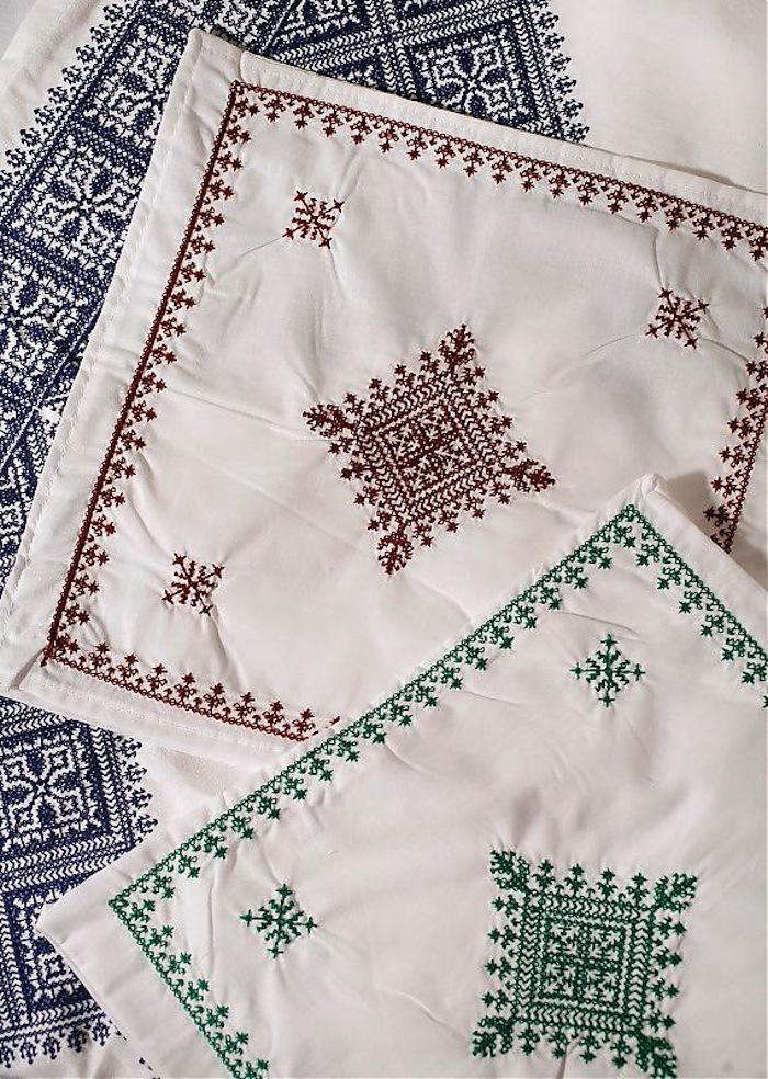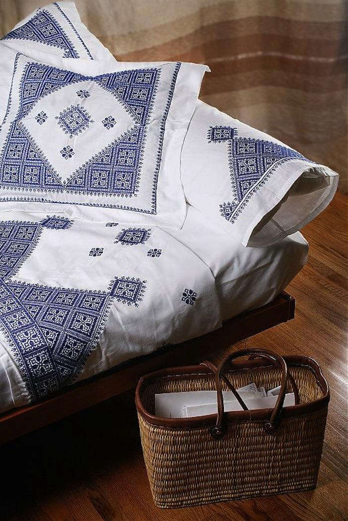 Above: Embroidered Bed Linens are available in a flat or a queen set, which includes an embroidered flat sheet, two 26-inch-square shams, and a bolster cover, for $220.