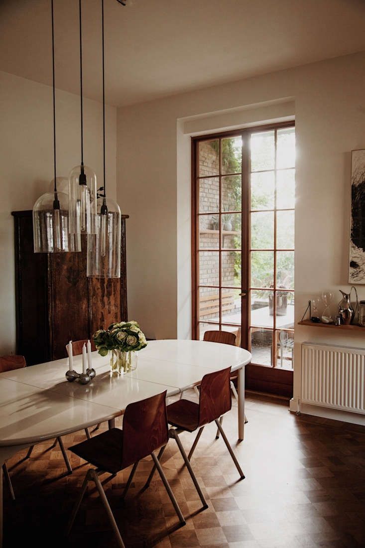 Above: Susanne fashioned the pendant lights from glass cloches. The table is a Hans Wegner that she had painted after it sustained some water damage.