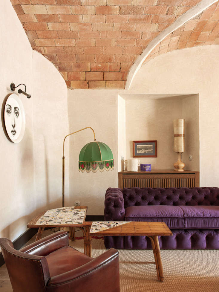 Above: “Wes Anderson’s Grand Budapest Hotel was an inspiration for a lot of the design details,” says Pol—such as the lobby’s locally made Chesterfield sofa (in a velvet from Güell Lamadrid, fireproofed per local regulations) and Lobby Boy hat. Note the Fornasetti tray hung as art. The fringed lampshade is the first of many.
