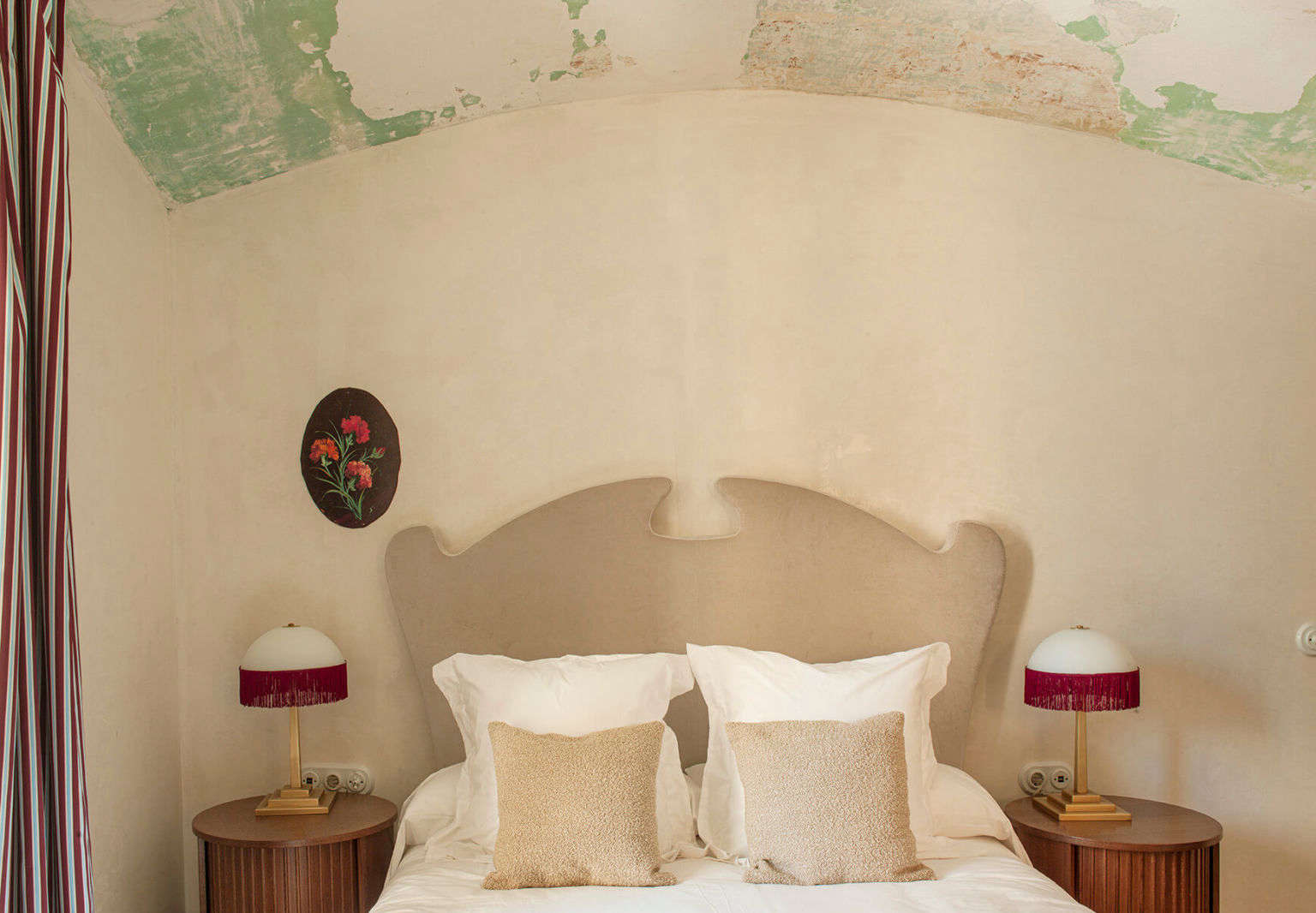Above: Under an atmospheric raw ceiling, a fanciful headboard flanked by fringed lamps.