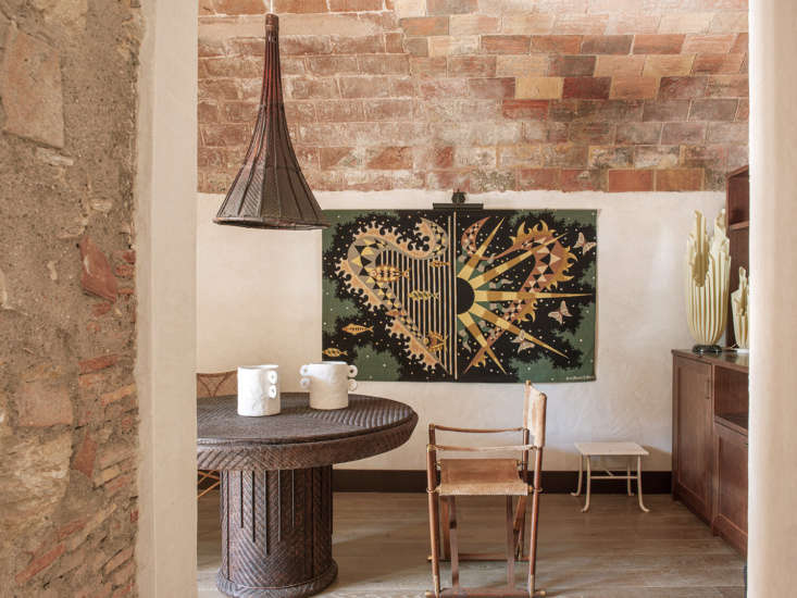 Above: In the bar/winter breakfast area, the designers paired a rattan table found in a Barcelona antiques shop with a light made from a Vietnamese rice picker. The vintage tapestry is by Jean Picart Le Doux.