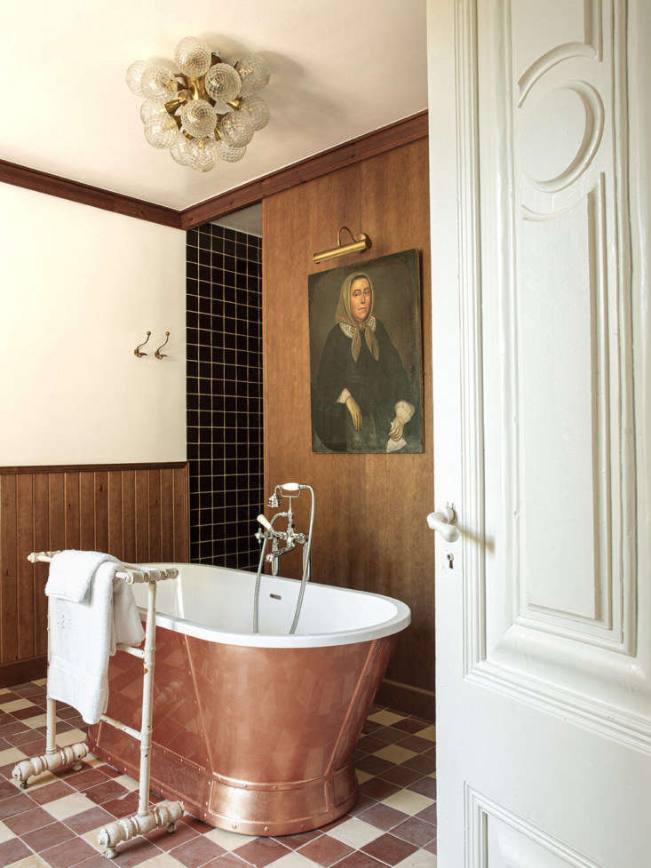 Above: A copper tub in the Valentina suite. The historic portrait, Pol says, is emblematic of the whole design: “the idea was to pay tribute to the women who made our society but have never been recognized.”