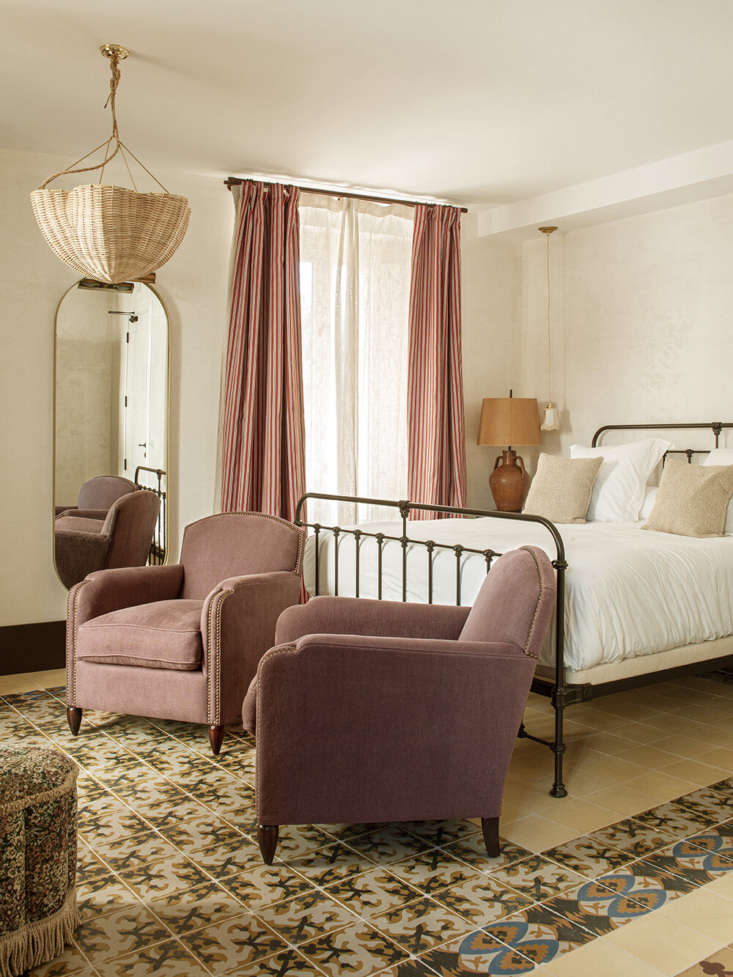 Above: A wicker pendant light and Spanish encaustic tile in another of the bedrooms. Each has striped curtains in a different colorway.