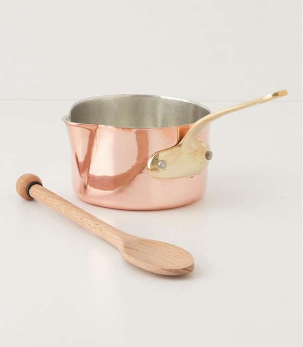 Above: The small Ruffoni Copper Sauce Pan is handmade in Italy and holds 19.5 ounces; $118 from Anthropologie, wooden spoon included. For vintage copper stockpots and other cookware in a range of shapes and sizes, take a look at Four & Twenty.