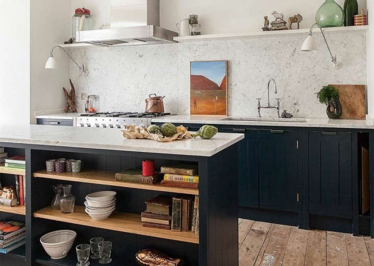 Above: The lower cabinets are painted in Farrow & Ball’s Hague Blue, a shade that in different lights ranges from warm black to navy; $105 per gallon.