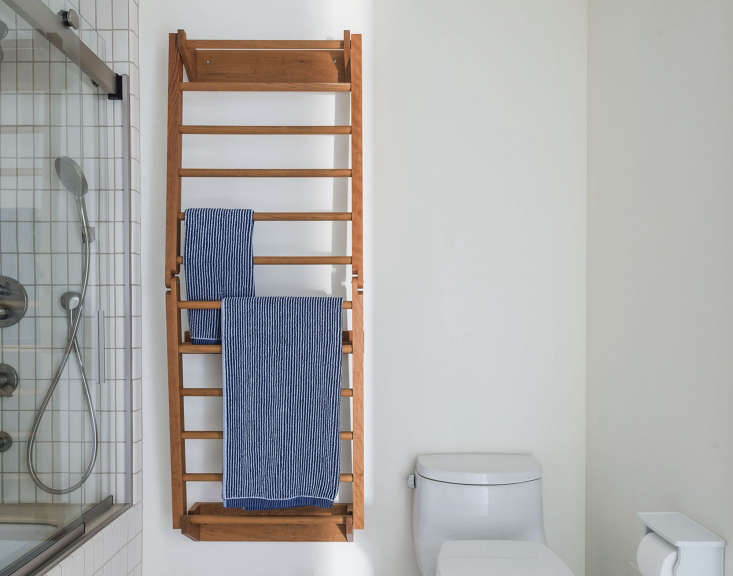 Above: A custom towel and drying rack hangs on a wall. Requested as a solution for tight quarters, it folds out to offer more rods for layering with laundry.