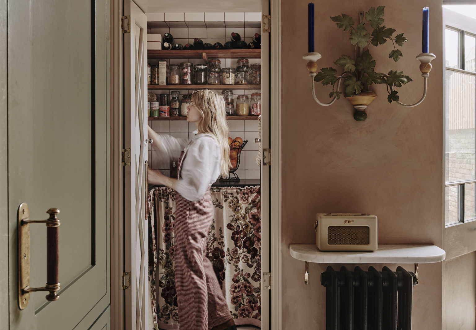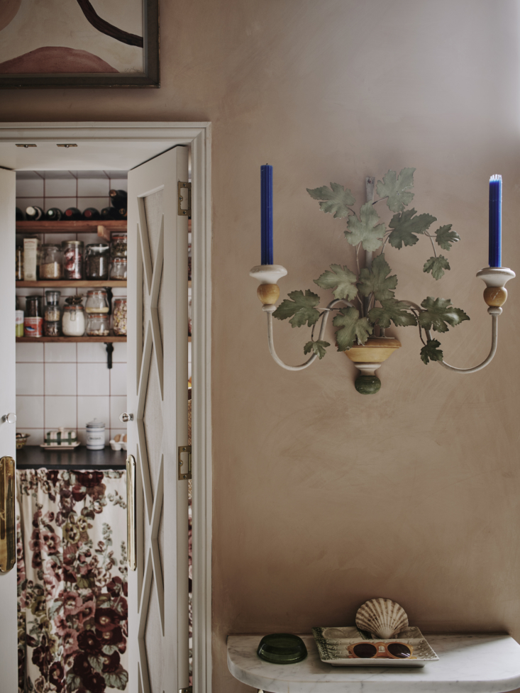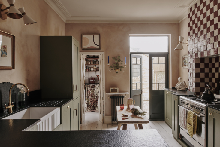Above: Matilda’s small kitchen in her London home features granite counters (notice the scalloped backsplash behind the sink) and cabinets painted Sage Green from Little Greene. The walls are painted with a peachy lime wash from Bauwerk. A slim doorway on the left leads to the tiny pantry.