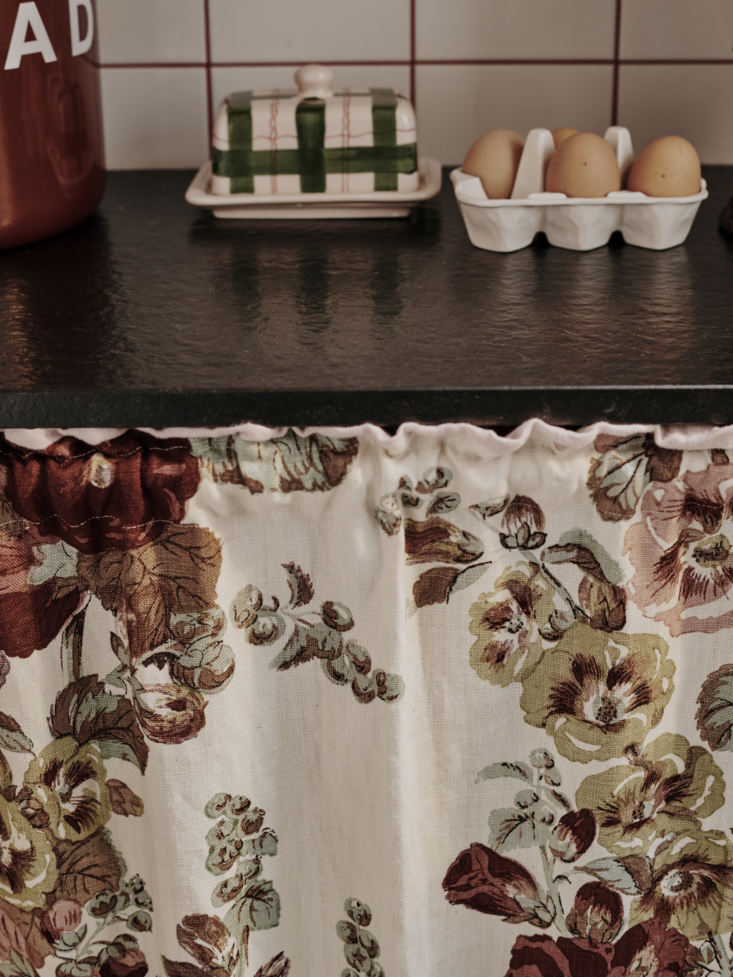 A while back, we spotted on the historical real estate site Inigo the extremely charming pantry of Matilda Goad, the talented British designer who never met a scalloped design she didn’t like (her online store has napkins, lamp shades, and planters—all of her design and all featuring the charming silhouette). Not surprisingly, she has a penchant for floral prints and vintage pieces, too, but she elevates and modernizes the granny chic aesthetic with bold colors and graphic elements.