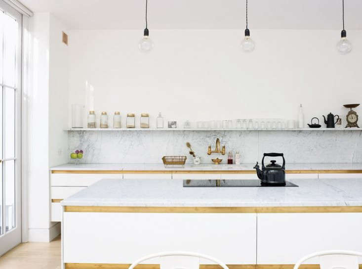 Above: Countertops, backsplash, and floating shelf are all Carrara marble. Agonizing over your own counters? See Remodeling 101: Five Questions to Ask When Choosing Your Kitchen Countertops. Wondering whether marble is for you? See My Dirty Secret: How I Learned to Live with a Marble Backsplash.