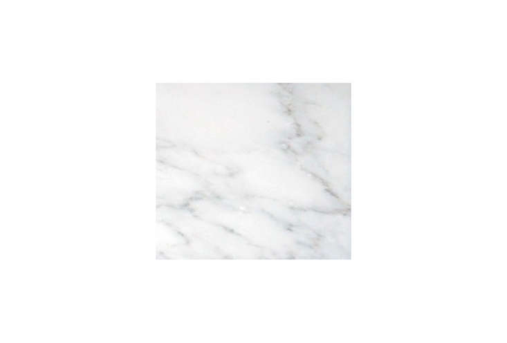 Above: Unlacquered brass fixtures add warmth to the Carrara marble countertops, backsplash, and shelf.
