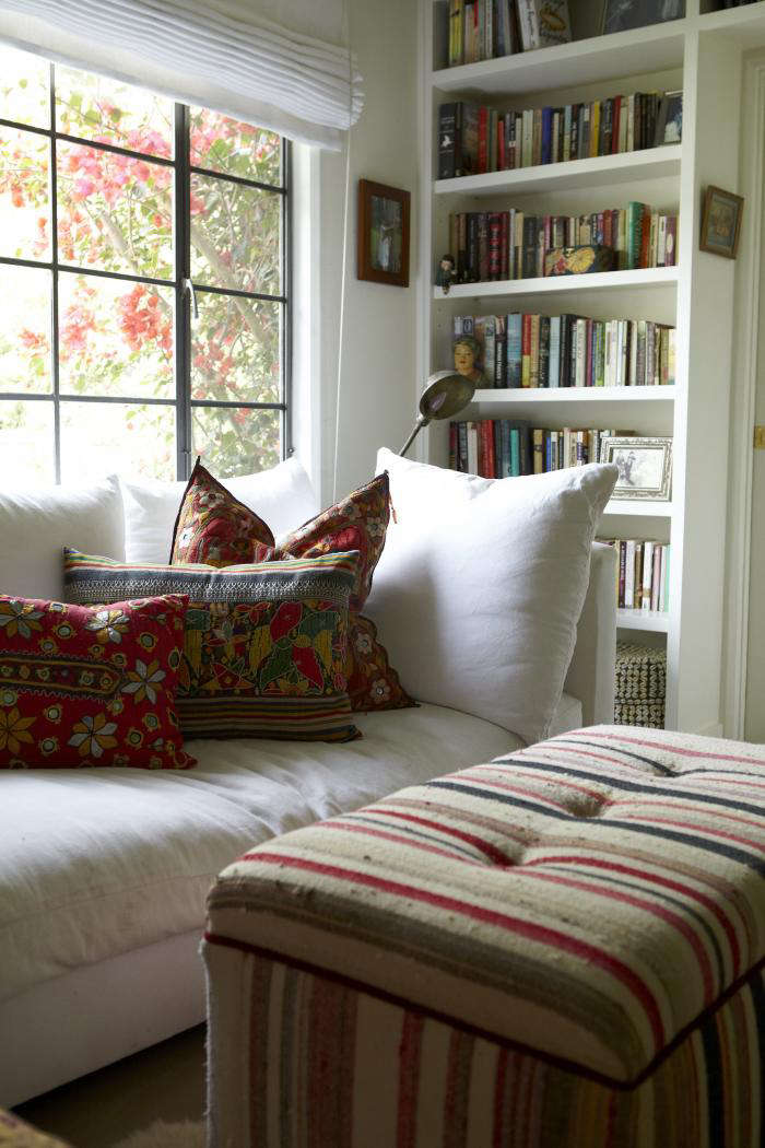 Above: Rose’s living room features a mix of fabrics—a striped ottoman and ethnic patchwork pillows.