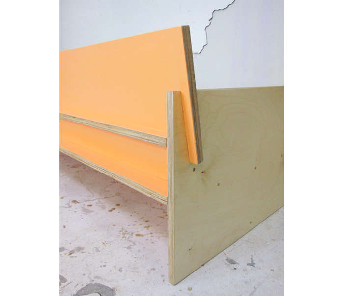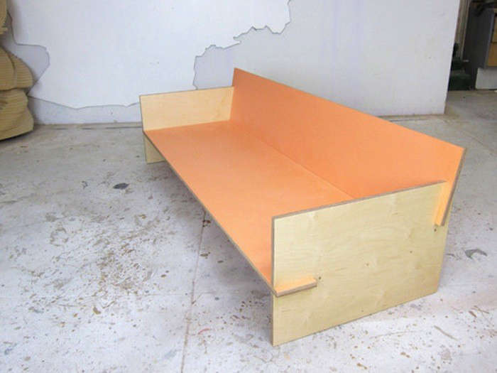 Above: The Colorblock Sofa has a low sunken seat made from Baltic birch plywood, hand finished and painted a cantaloupe orange.