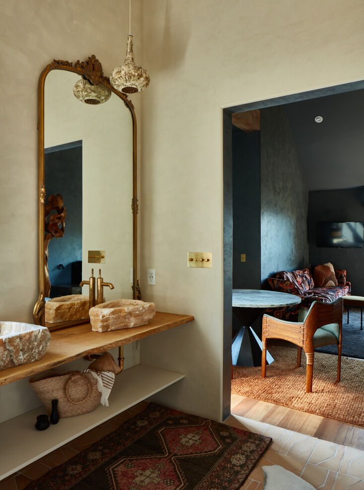 Above: The romantic en suite bath has mine and yours onyx sinks found on Etsy from Gem Look Design. The brass faucets are by California Faucets. The rococo Amelie Floor Mirror is an Arhaus design.