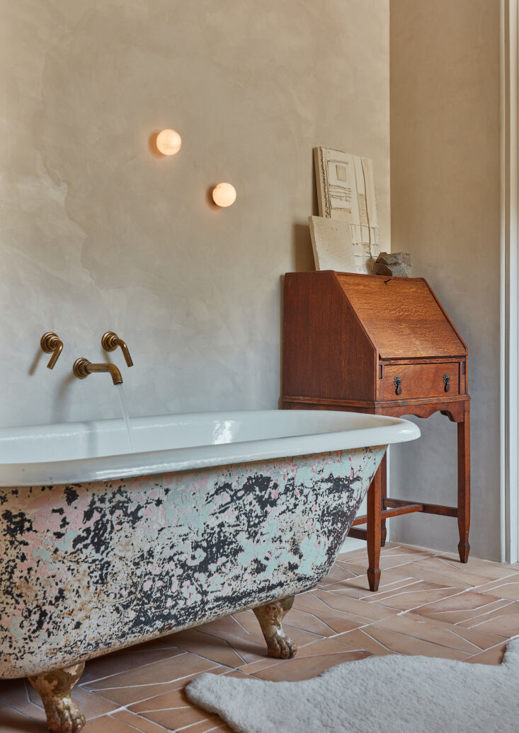 Above: The salvage yard claw-footed tub came with an interior that eventually scrubbed clean. It stands on Cotto terracotta tiles from Zia. The antique drop-front desk serves as a medicine cabinet.