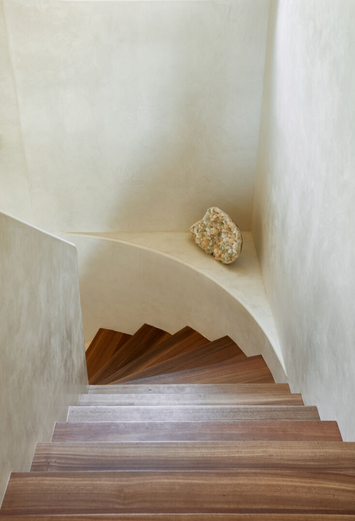 Above: The carpeted stair was reconstructed as a winding, sculptural design of sugar gum eucalyptus from Angel City Lumber.