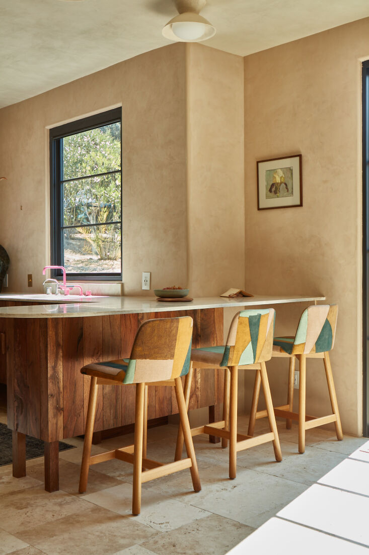 Above: Gabrielle reupholstered her clients’ existing DWR bar stools in a Kelly Wearstler’s District Fabric that picks up the kitchen’s warm tones. The ceramic Cadmus Surface Mount Ceiling Lights are by Remodelista favorite In Common With.