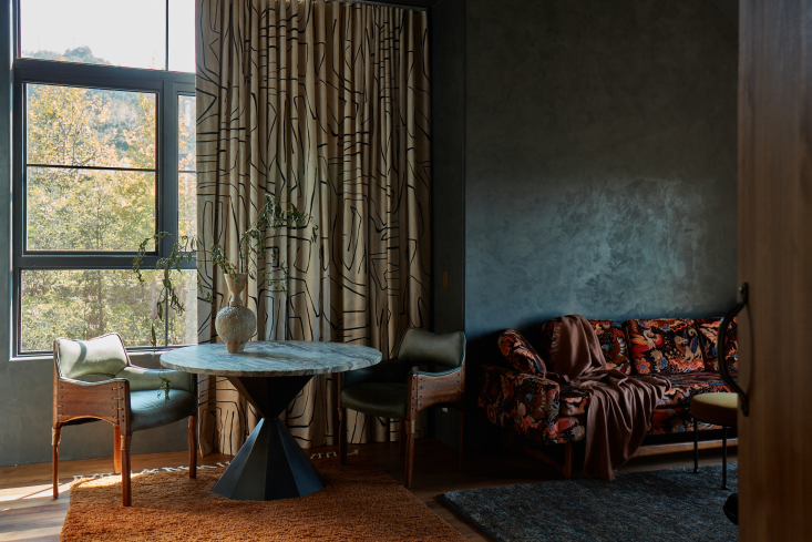 The vintage marble-topped table from Hollywood At Home has become the morning coffee spot. It gets used during the day as a desk. The floor-to-ceiling curtains are Kelly Wearstler’s cotton-linen Graffito Fabric and the rugs are from Armadillo.
