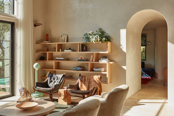 Above: A pair of 1970s leather Falcon chairs by Sigurd Ressell stand by Aker Studio custom book shelves. The Claude throw blanket is by Morrow. The floor lamp is an Entler design of cast stoneware: see more of the studio’s tendril-like lighting in Block Shop’s Mod LA Headquarters.,