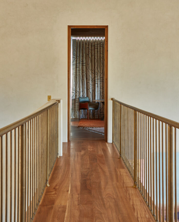 Above: An unlaquered brass railing lines the catwalk between the two upstairs bedrooms.,