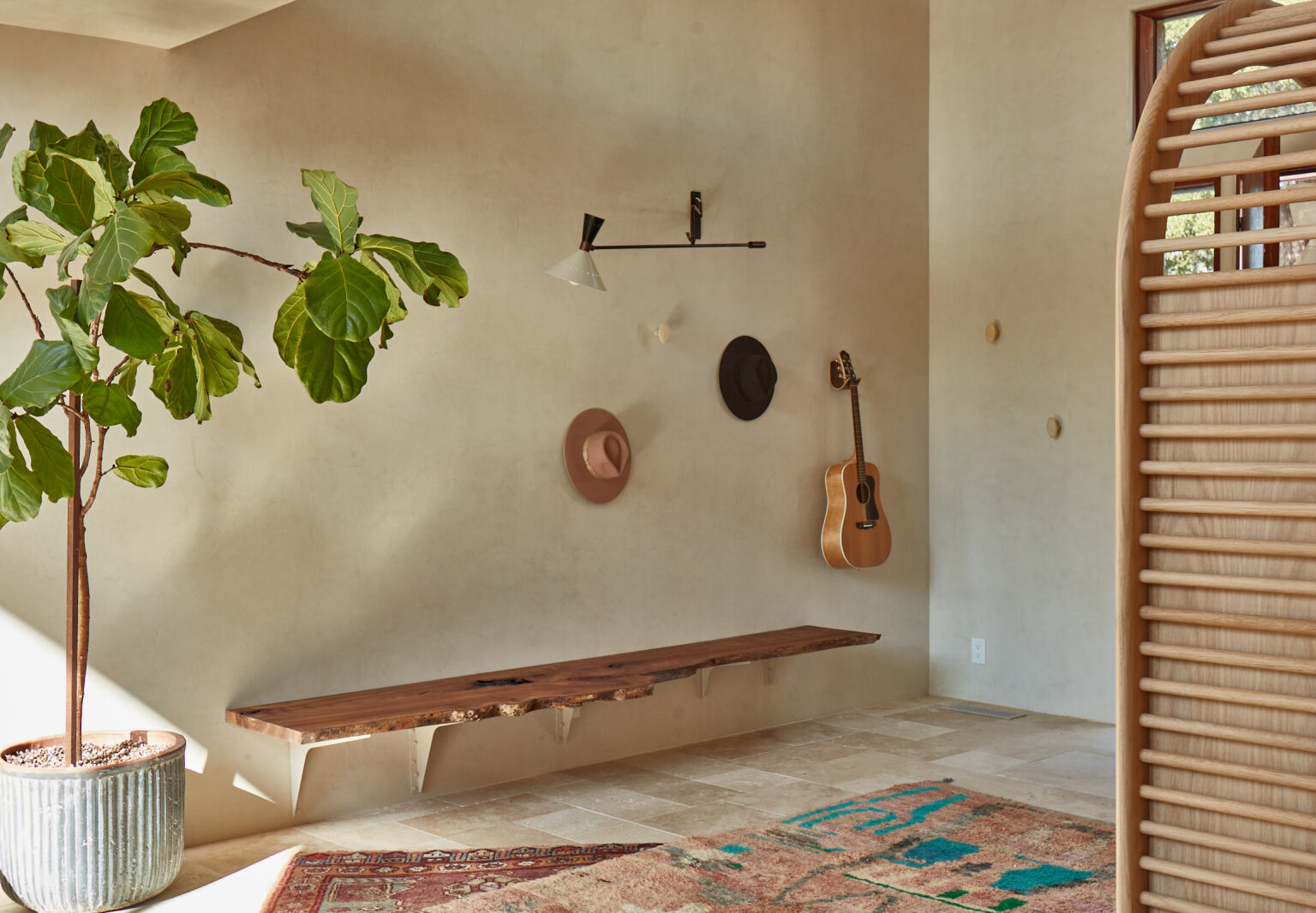 Above: The smart casual foyer has a bench made from a live-edge panel supplied by Angel City Lumber, which sources its raw materials exclusively from felled trees. According to the firm’s site, “when a tree comes down in LA County, our work is to retain the worth both of the wood and the living spirit of a part of our city.” Throughout the house, the Aker team used Roman Clay, a luminous plaster wall finish applied with a putty knife. Selected as a eco-friendly alternative to latex, it’s a speciality from LA’s Portola Paints; the shade shown here is Patagonia. The Cobble Wall Hooks are by Stahl + Band: see Luxury Crafts in Venice, CA.,