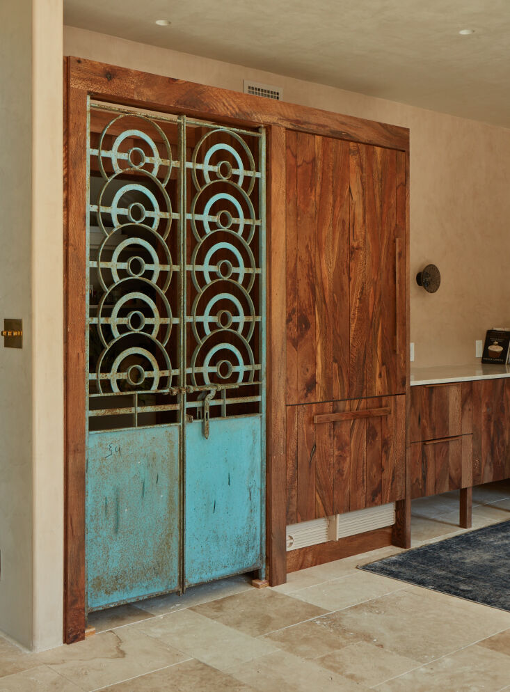 Above: Gabrielle’s clients found the metal doors in a salvage yard and she put them to use for the pantry: “solid doors would have created a heavy imbalance on that side of the room, so the airiness of the gate was perfect.”