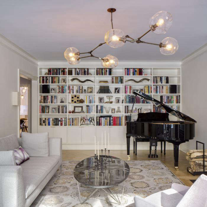 Above: For the musical family, the piano occupies an important corner of the living room in front of a wall of custom built bookshelves and storage.