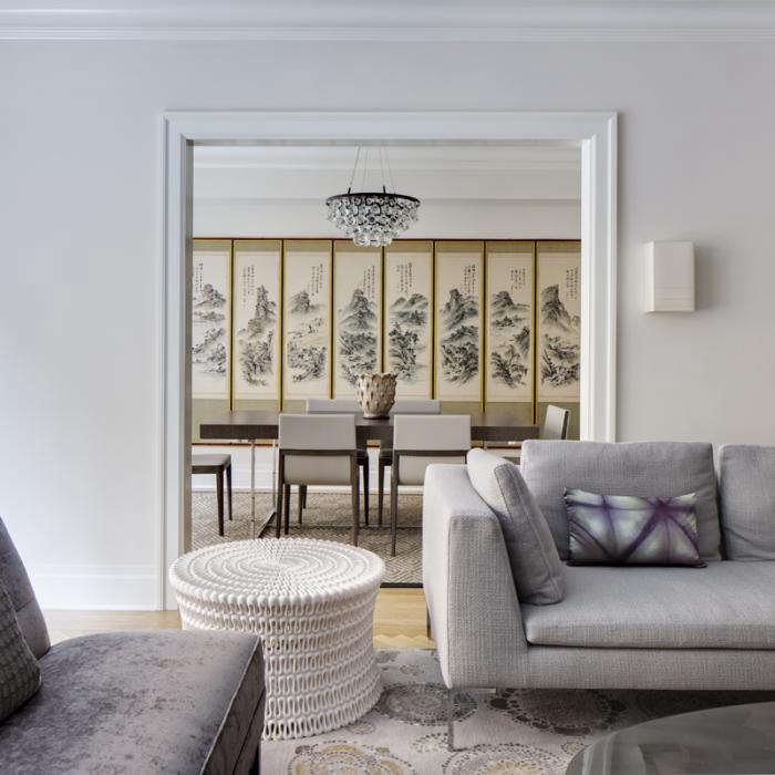 Above: A muted palette of grays, selected by interior designer Debra Notis, works well with the Korean landscape paintings that represent the four seasons and presented to the client by her parents as a wedding present. An Arctic Pear chandelier from Ochre hangs above the dining table and chairs from B&B Italia. The living room sofa is also from B&B Italia while the textured side table is from Oly.