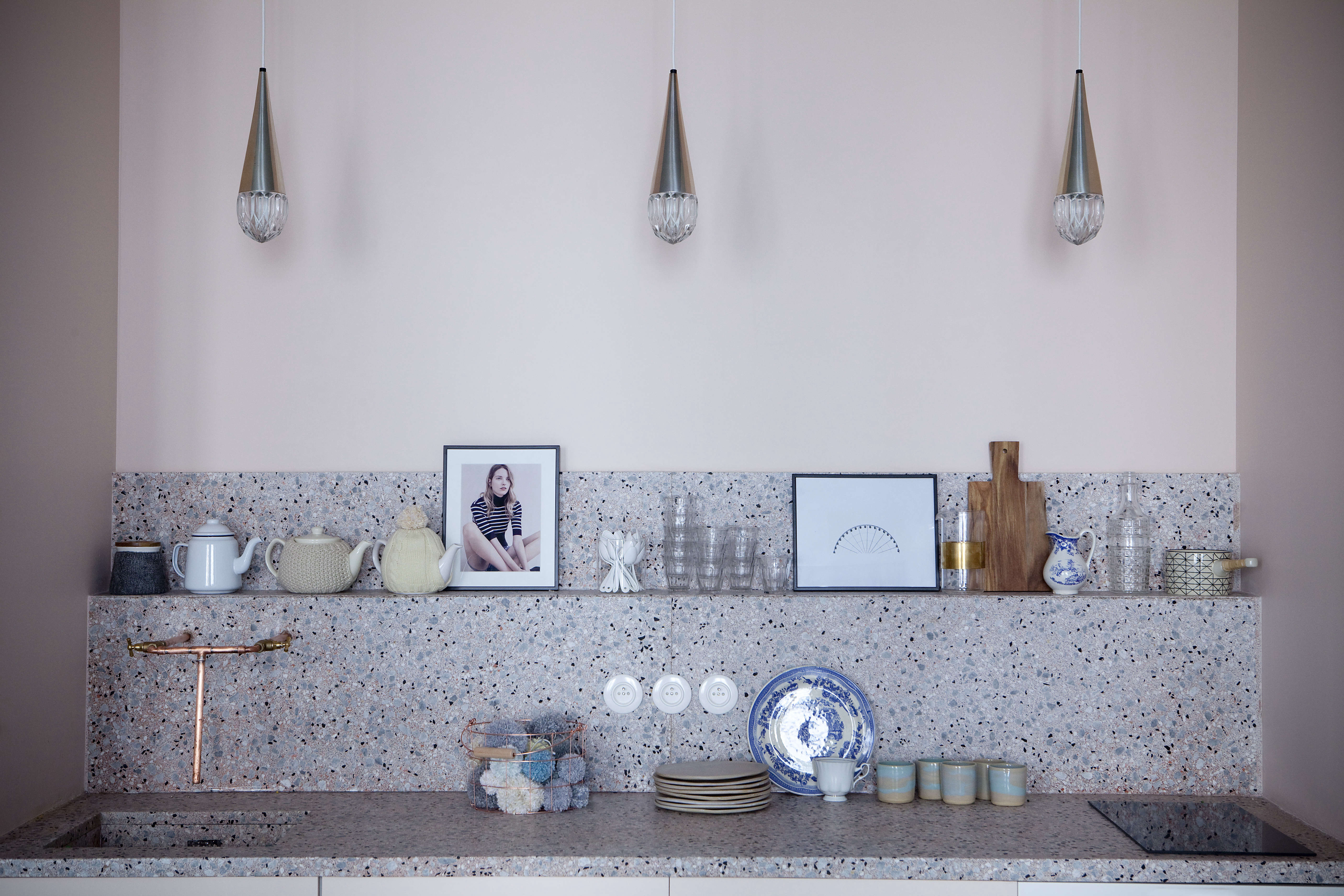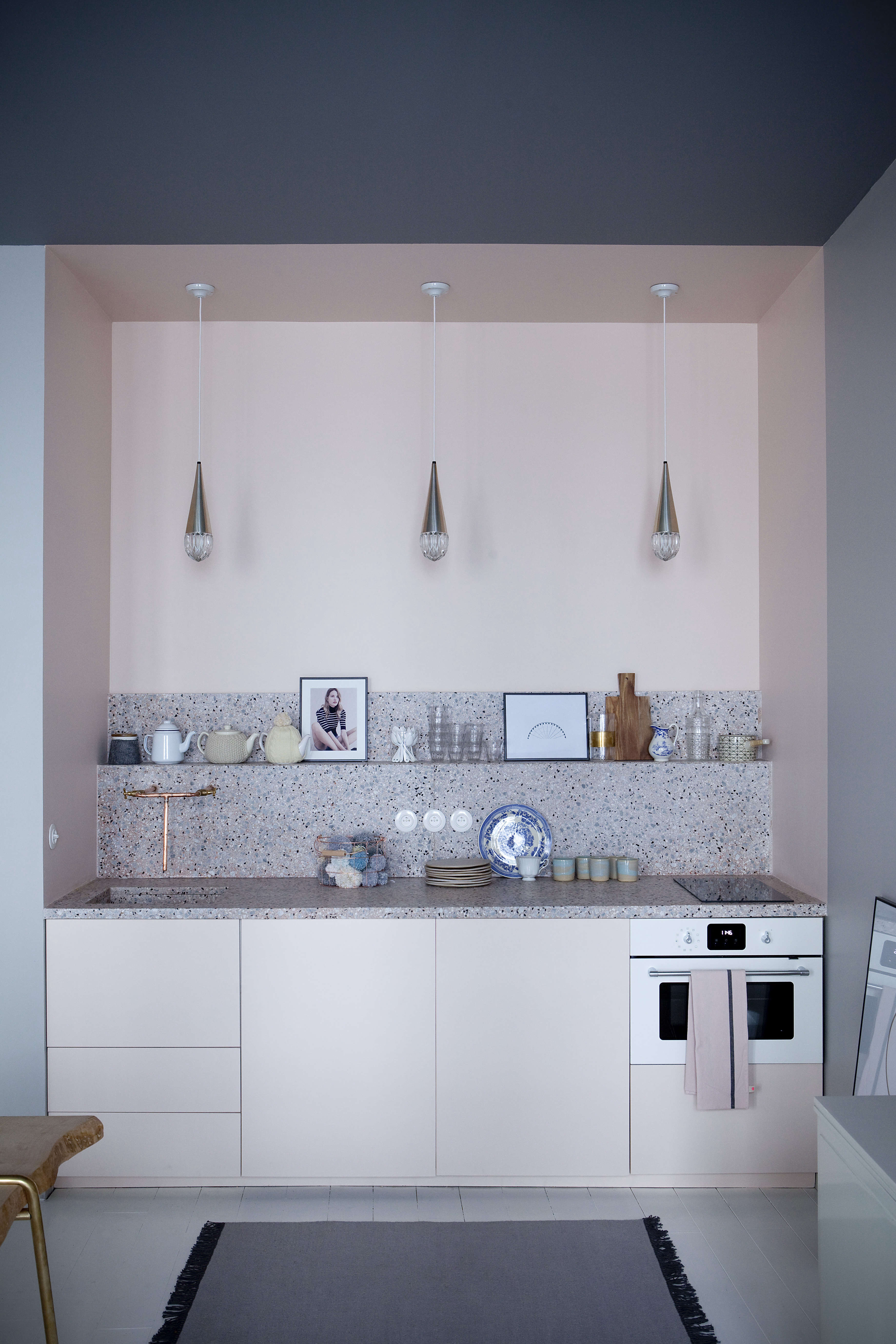Above: The compact kitchen is painted Pink Ground and features terrazzo counters and a backsplash with a display ledge. Something of a lost art in the US in recent decades, terrazzo has been on the rise again. “It’s less expensive than marble,” Sandrine Place tells us. “And you can choose the color you want and also the size of the stone shards.” The range and tiny induction cooktop are from Ikea and the cabinets are custom.