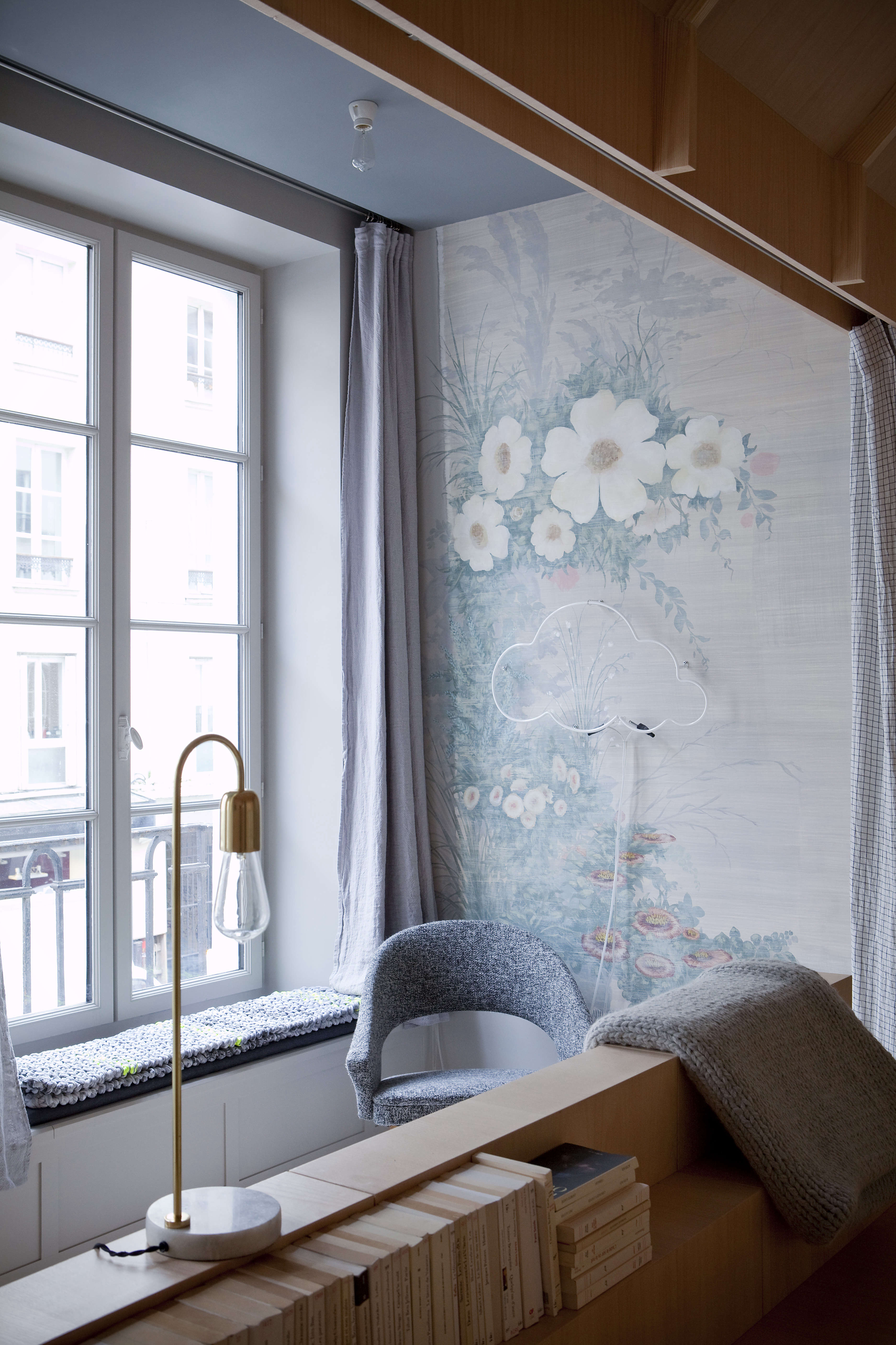 Above: The room has a view of Rue de Charonne and a bookshelf is tucked at the foot of the bed. The brass and marble lamp is by Bloomingville.