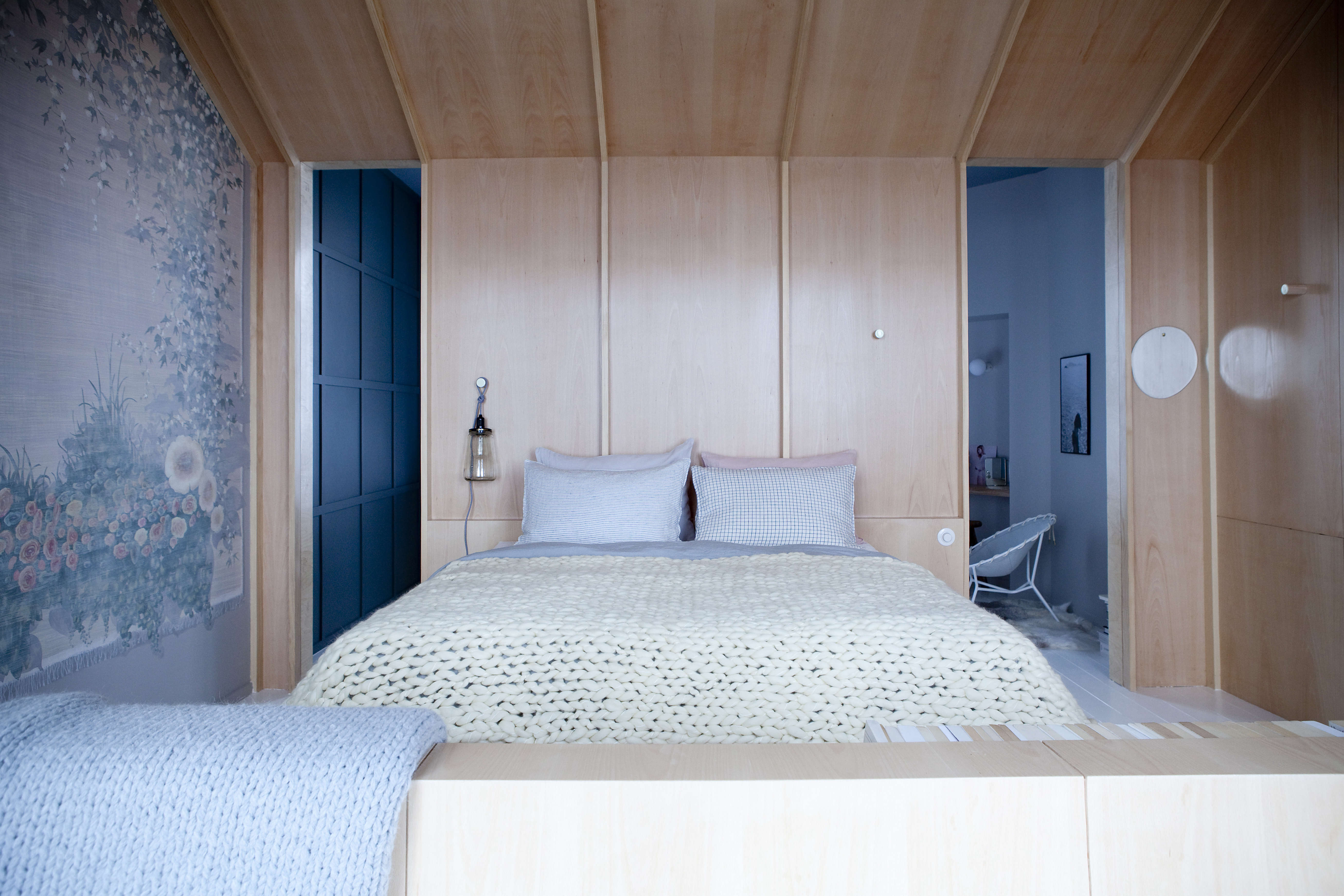 Above: The platform bed is set in its own modern cabine of beechwood with linen privacy curtains.