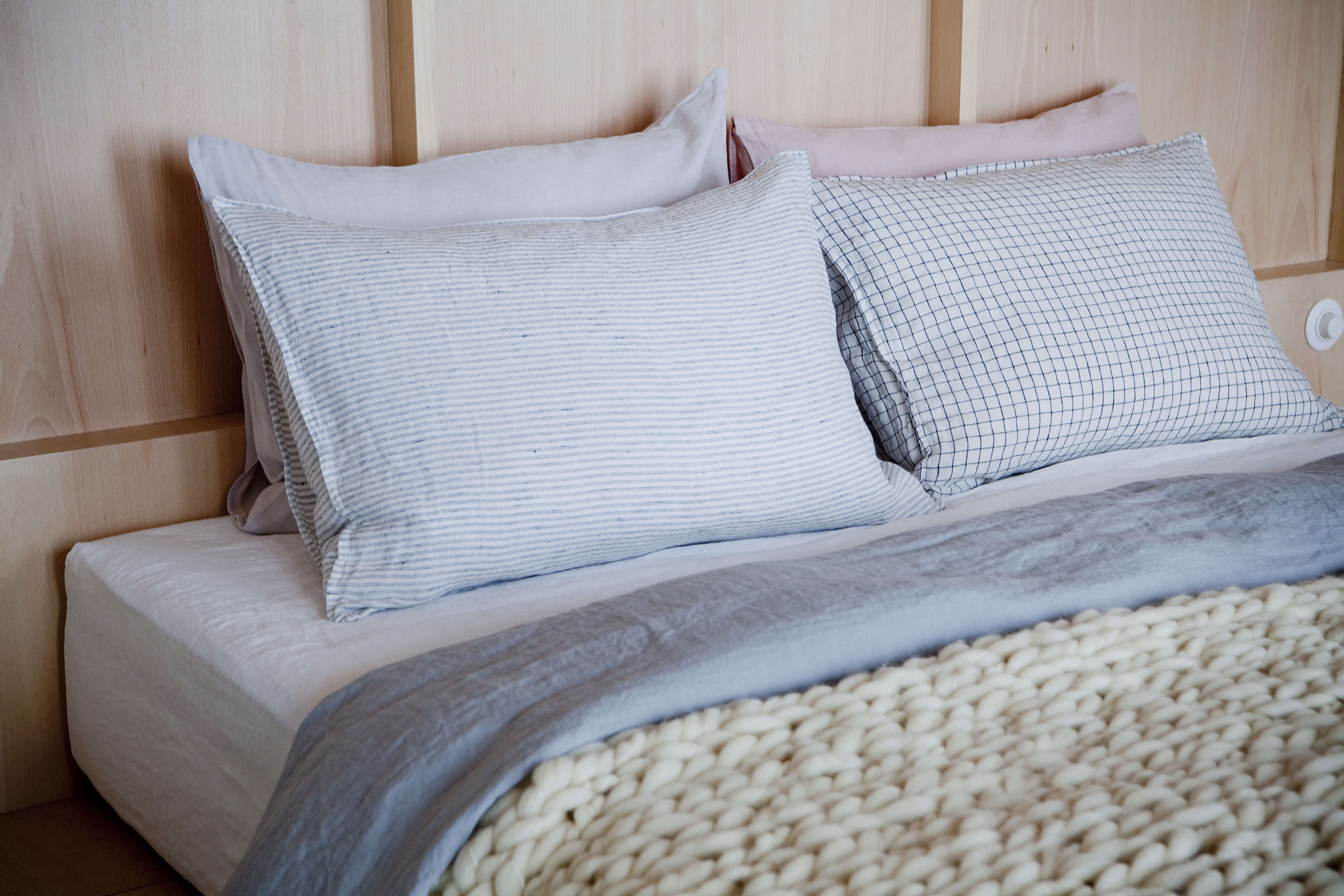 Above: The bed is layered with a wool blanket commissioned from a knitter in the Ukraine and linen sheets by Linge Particulier.