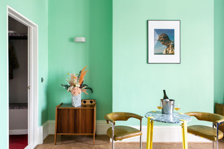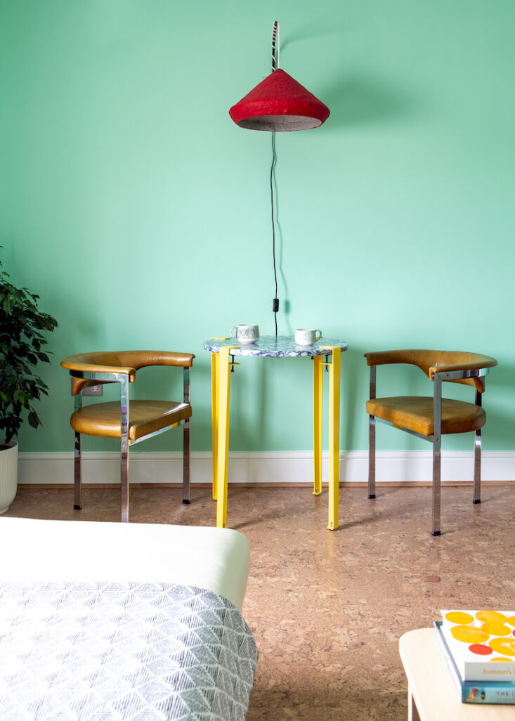 The rooms—which start from £380 for a two-night stay—are Lee’s first interiors project. “The research took a long time,” he says, “but I decided very quickly that however much I liked an item, if it didn’t fit into our ethos, it wasn’t going in. The design grew organically from there.” What were three “slightly tired” Airbnb rooms are now fresh, original seaside suites incorporating locally crafted marbled wallpaper, mycelium grown lamps, re-dyed waste wool rugs, cork floors, recycled and bio-plastic furniture, and bone china cups made using waste fish bones from the restaurant. Join us for a look: