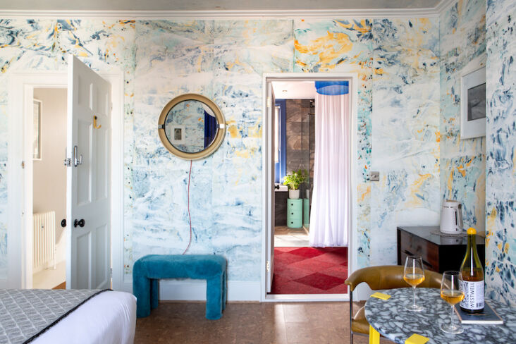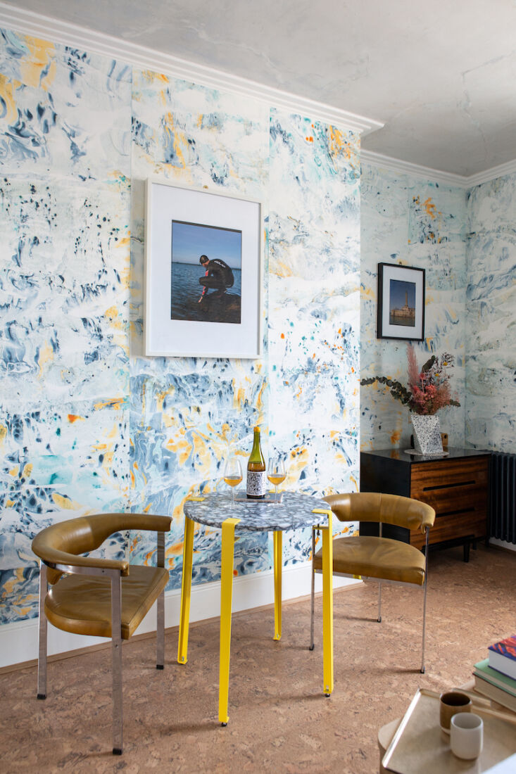 Room two is wrapped entirely in marbled paper handmade by the local maker, Natascha Maksimovic: “This is the first time I have been commissioned to hang an entire room,” she explains. “Together, we chose a color palette that echoes the view outside and I suggested this abstract marble pattern, where I move and sway the paper on the water surface to really enhance the fact that these wallpapers are created with water. Although each panel is printed individually – and is therefore a unique piece – they sit alongside each other beautifully.”