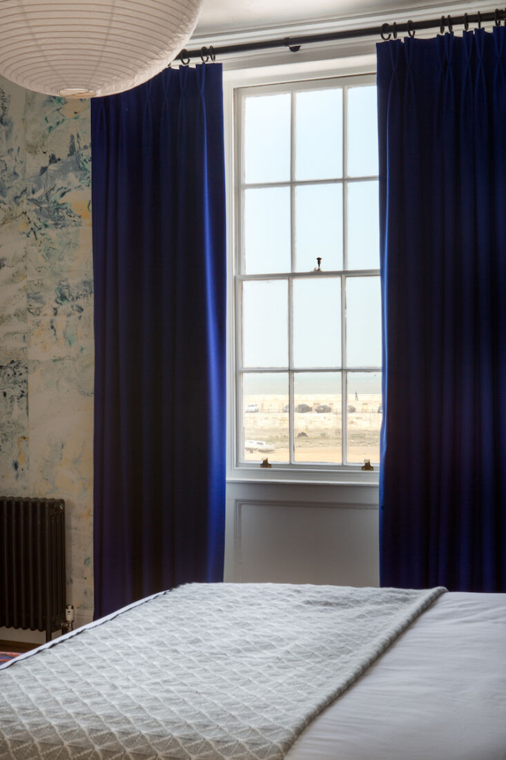 Above: Overlooking the harbour. “We worked closely with Margate-based Clueit Webb to source a range of fabrics for the rooms,” explains Lee. “The bright blue 100% Laneve wool is from Camira, and is traceable right back to the individual farms. It is produced using non-metallic dyes.”