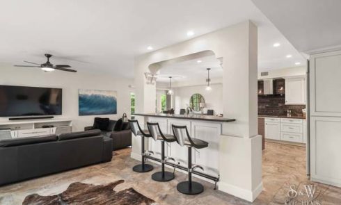 Bright kitchen with white cabinets, a central island with wicker stools, and wooden beams on the ceiling. The room features a stove, a plant, a basket of apples, and a window allowing natural light to stream in. A sofa with cushions is in the foreground.