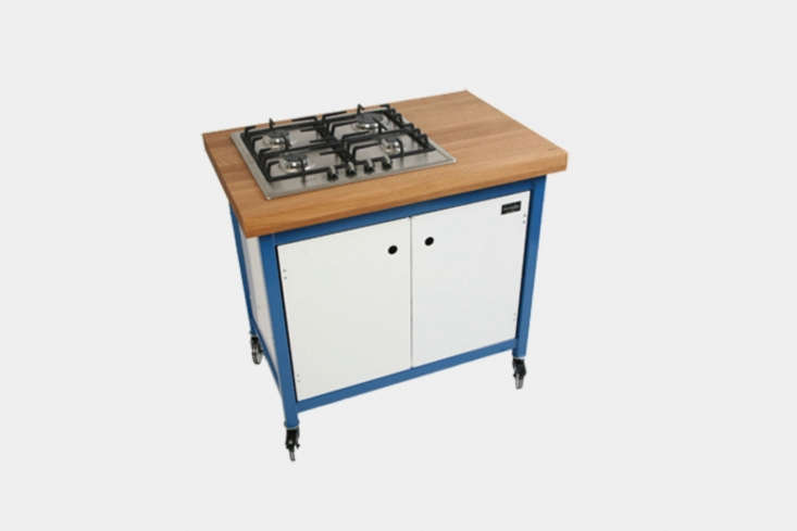 Above: The Kochwagen KW100, shown in blue and white (color combinations are customizable across white, black, red, blue, and yellow), is €3,200. It has a four-burner cooktop.