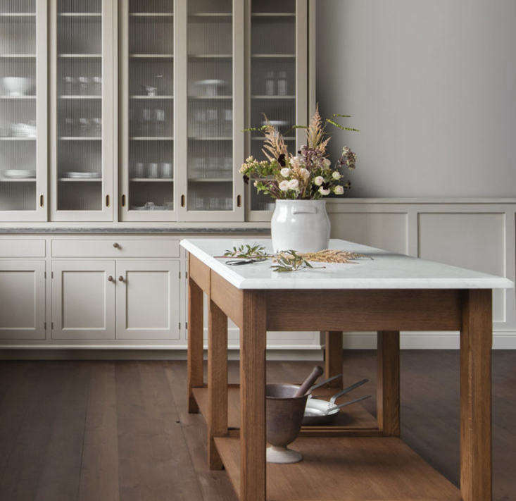 Above: Reminiscent of Downton Abbey, the center-of-the-room work table is made of stained oak and Carrara marble.